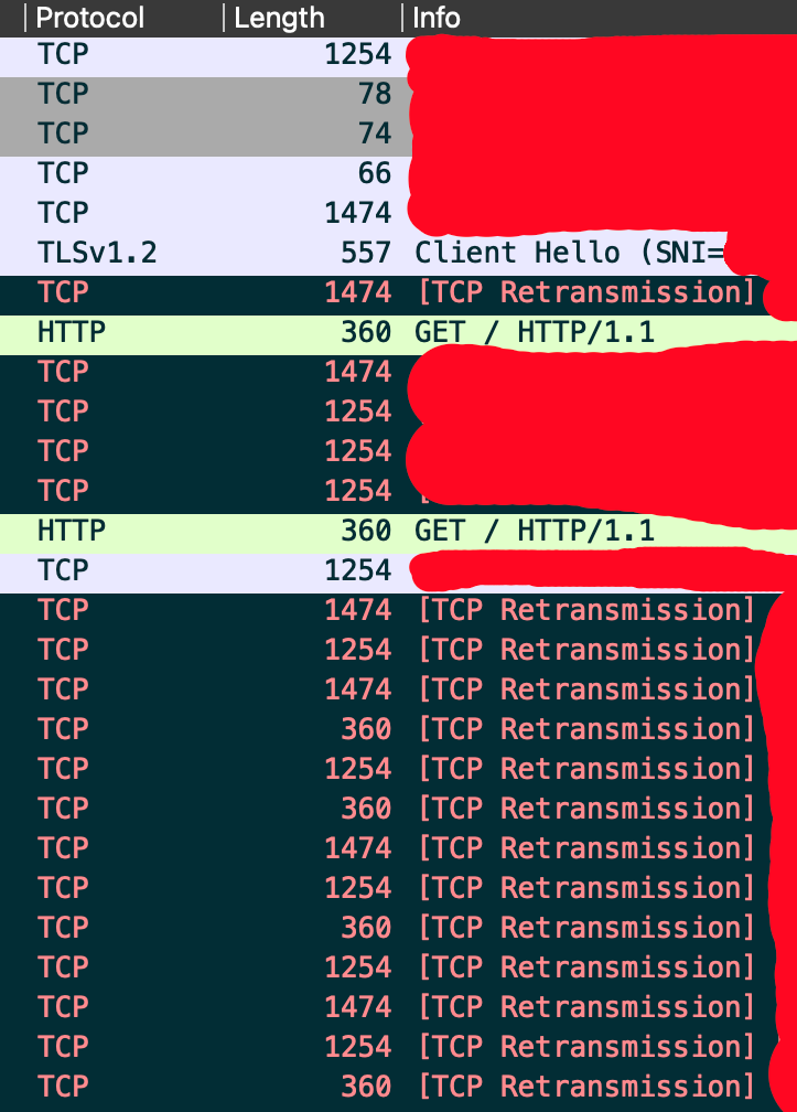 Hmmmmm, nm then, here is how literally any internet request to ‘not-whitelisted-IPs’ (not whitelisted as in the sense of they’re definitely not “prioritized“ to work without issues, however I still think that it’s some sort of throttling mechanism) looks like (so you get a better understanding of the situation…) on the whitelist-network(the ‘length’ is the byte-size, so you can see what requests go through, and which ones get blocked (requests larger than x amount, mostly, you can notice that there are 2 huge packets that somehow still come through, the first SNI packets come through, even if they’re large)):
