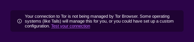 - Hide the message "Your connection to Tor is not being managed by Tor Browser " in new tabs of Tor Browser. (#21215)