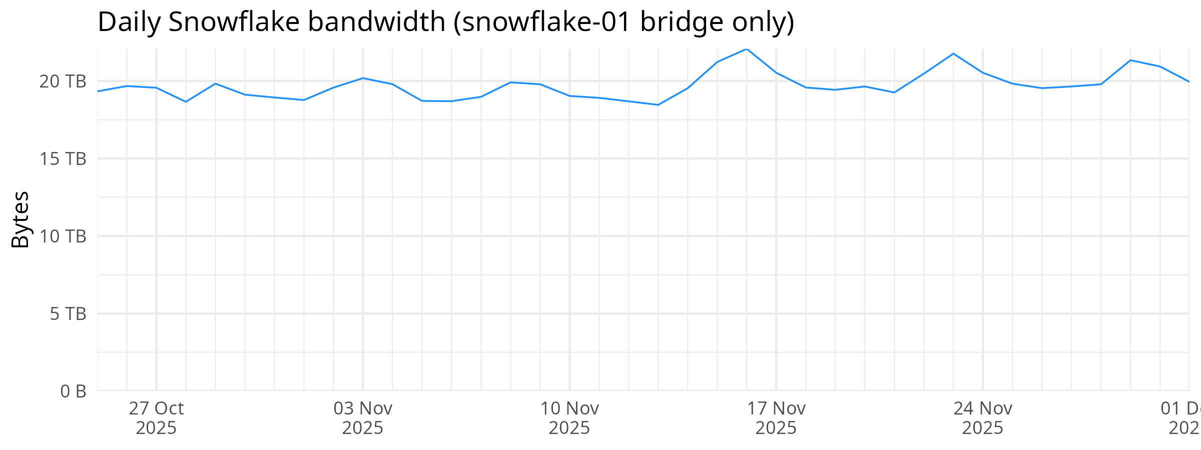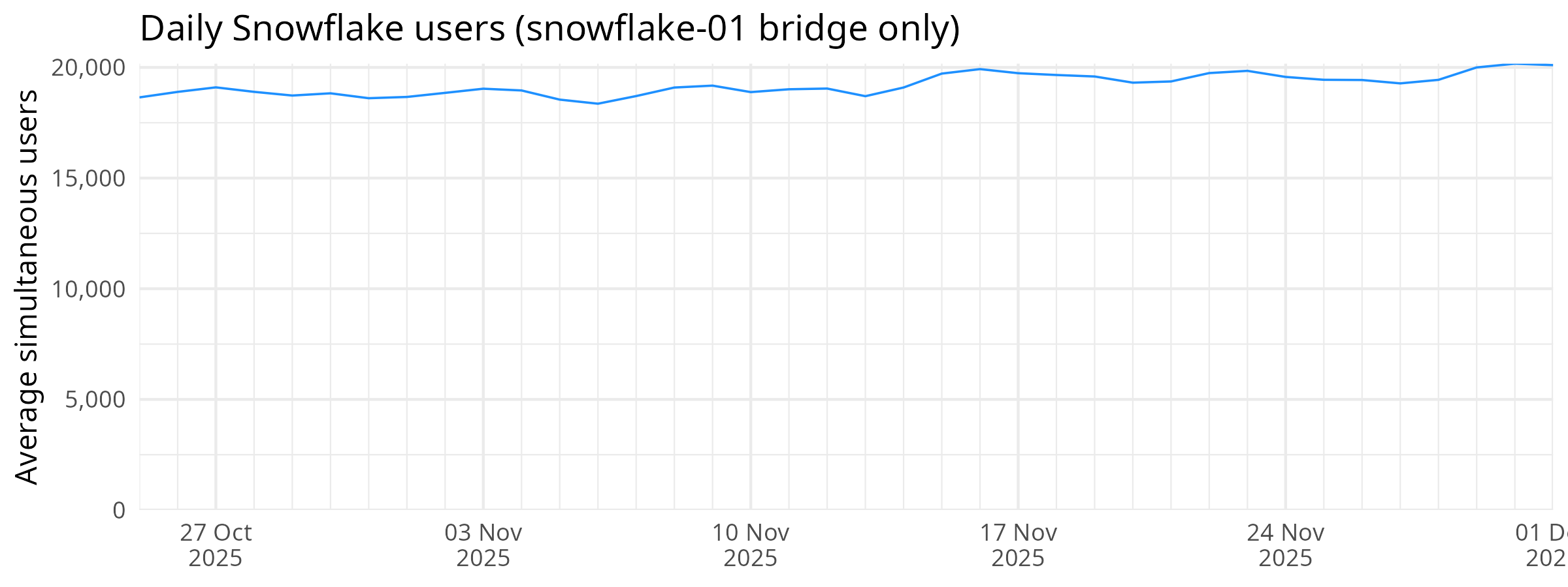 Usage of the snowflake-01 bridge was stable throughout November 2025. There were no big changes, only a slight overall increase in simultaneous users and bandwidth.